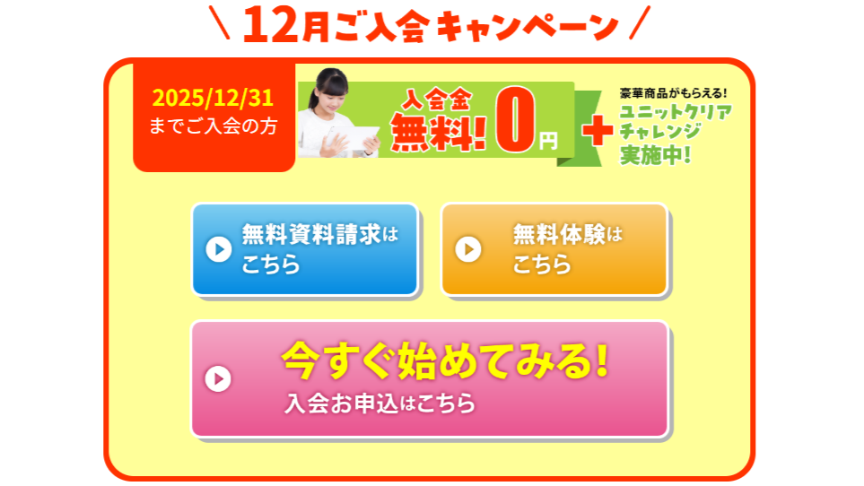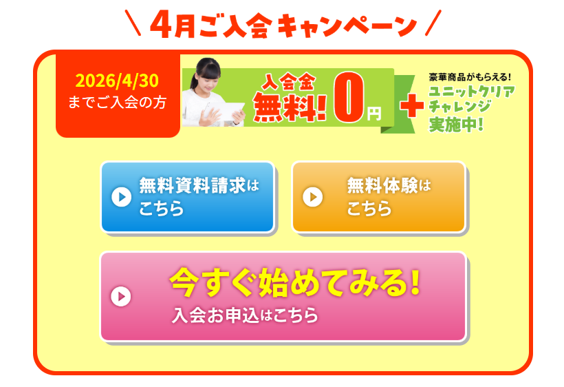 「お得なときに入会したい」「豪華景品がもらえる目標があるとお子さんのやる気が出そう!」という方は、ぜひ今月のキャンペーンを活用してください。